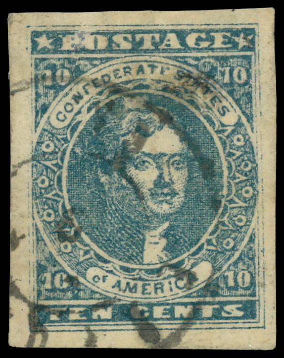 1861, 10¢ blue, Paterson printing (Scott 2), large margins all around, black town postmark; creases, Extremely Fine. Scott $180. (Image)