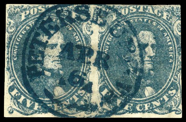 1862, 5¢ blue (Scott 4), horizontal pair, nearly full margins, only slightly cutting into right side, blue Petersburg, VA Apr 6 postmark; light wrinkle on right stamp, Very Good to Fine. Scott $470. (Image)