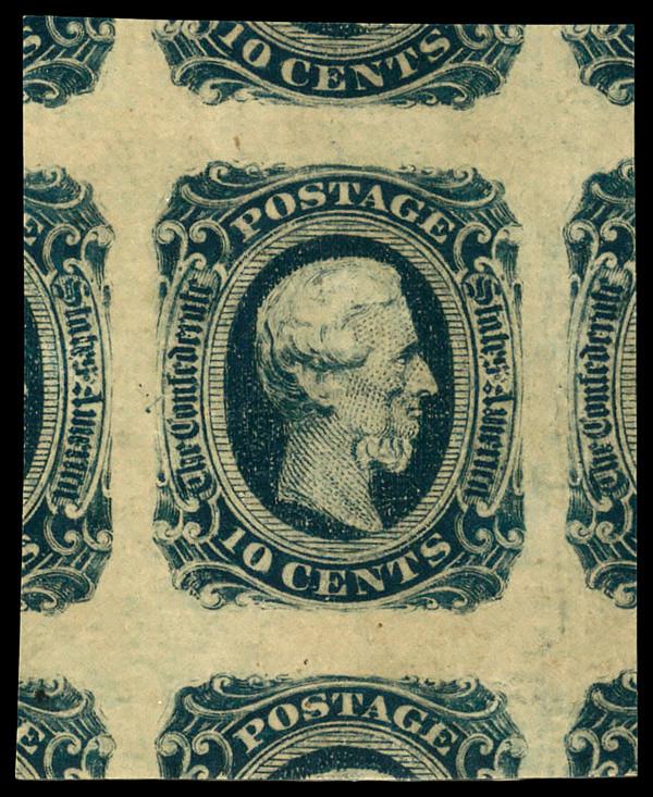 1863, 10¢ blue (Scott 11), right margin block of 10, nearly four full margins, only cutting into top, unused without gum; thins, soiling spots and small corner crease on lower left stamp, Very Fine. Scott $180. (Image)