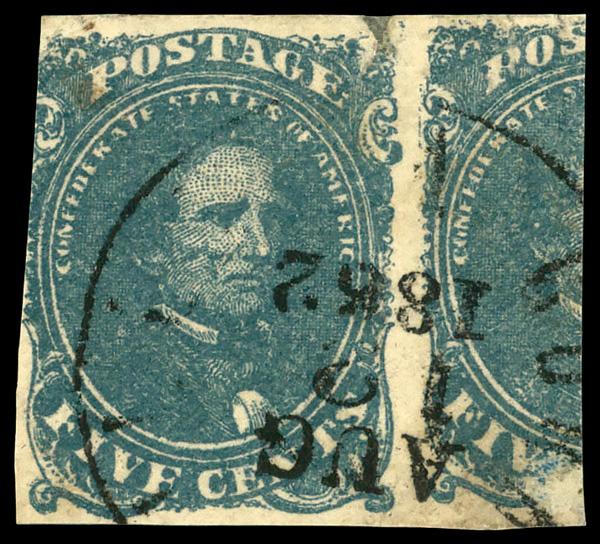 1862, 5¢ blue (Scott 4), full stamp at left and half of another stamp at right, three and a half margins, only slightly cutting into left, 1862 town postmark; creases and a couple small repaired faults at top, Very Good. Scott $125. (Image)