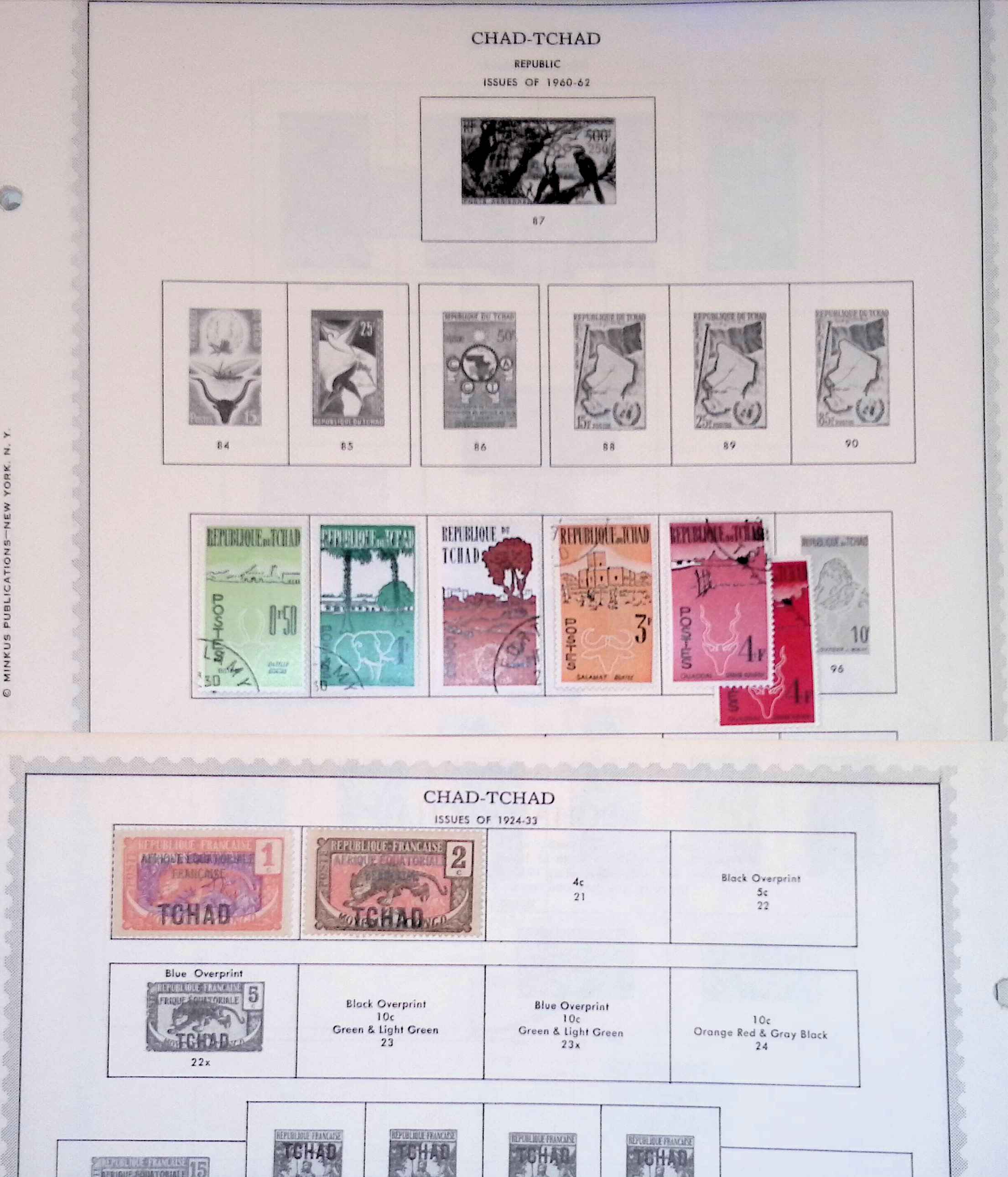 Chad. Starter Collection Lot made from Scott Internationals and Minkus Globals. Over 13 mostly filled pages, 14 dealer counter cards, 12 glassines with sets - estimate $50-100. (Image1)