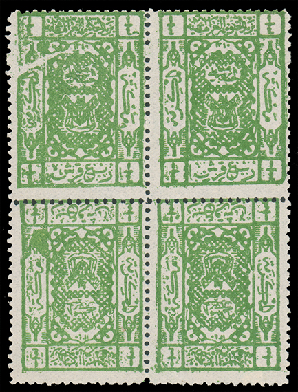 HEJAZ, 1924, ¼pi YELLOW GREEN TETE-BECHE BLOCK OF FOUR - ONE VALUE SHOWING CRACKED PLATE - MINT, #L48Aa, L48Ad, fresh, slight offset in gum, fine, scarce, cat. $500.00 with premium for cracked plate, Gibbons #57, 57a @ £380.00 without premium for cracked plate. Donated by Paradise Valley Stamp Company. (Image1)