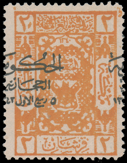 HEJAZ, 1925, 2pi ORANGE SHIFTED BLACK OVERPRINT MINT, #L94 var., h.r., fine-very fine, unlisted variety, Gibbons #119 var.. Donated by Paradise Valley Stamp Company. (Image1)