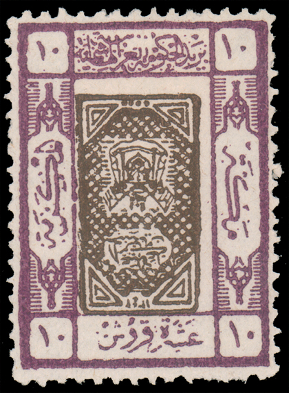 HEJAZ, 1924, 10pi VIOLET & DARK BROWN - INVERTED CENTER - UNUSED, #L50a, without gum, very fine, cat. $100.00, Gibbons #58a @ £130.00. Donated by Paradise Valley Stamp Company. (Image1)