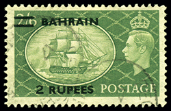 Bahrain 78b, 2r on 2sh6p Green, Ty III Overprint, with 16mm between "BAHRAIN" and "2 RUPEES", F-VF, with light ccls; very scarce! Cat($150). Donated by Sam Houston Duck Co.(Image1)