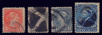 Canada 41//47, 3¢-50¢ 1888-93 Issue short set, (nos. 41, 42, 44a and 47), F-VF, postally Used with no. 42 heavy ccl Cat($99). Donated by Sam Houston Duck Co.(Image1)