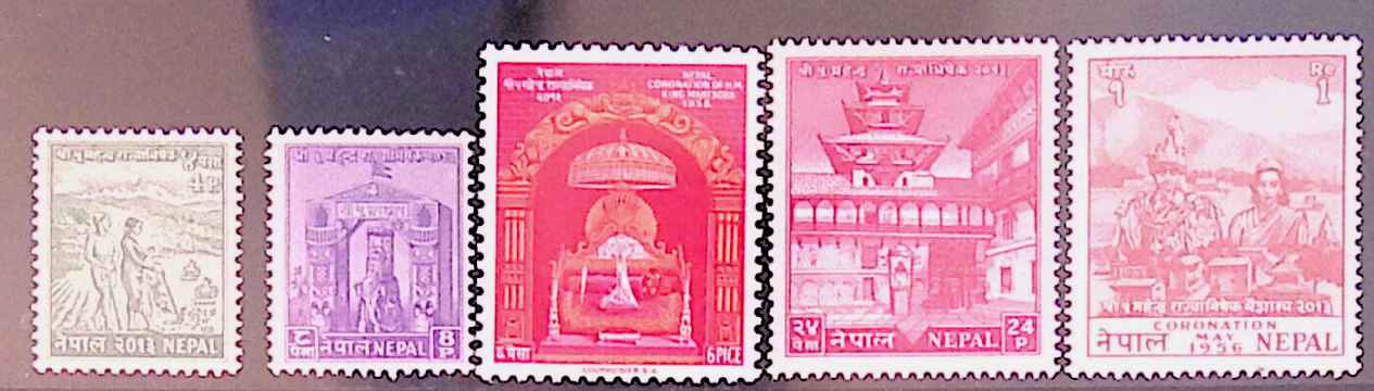 Nepal 84-88, 1956 Coronation set,. Mint never hinged. Estimate $100. (Image1)