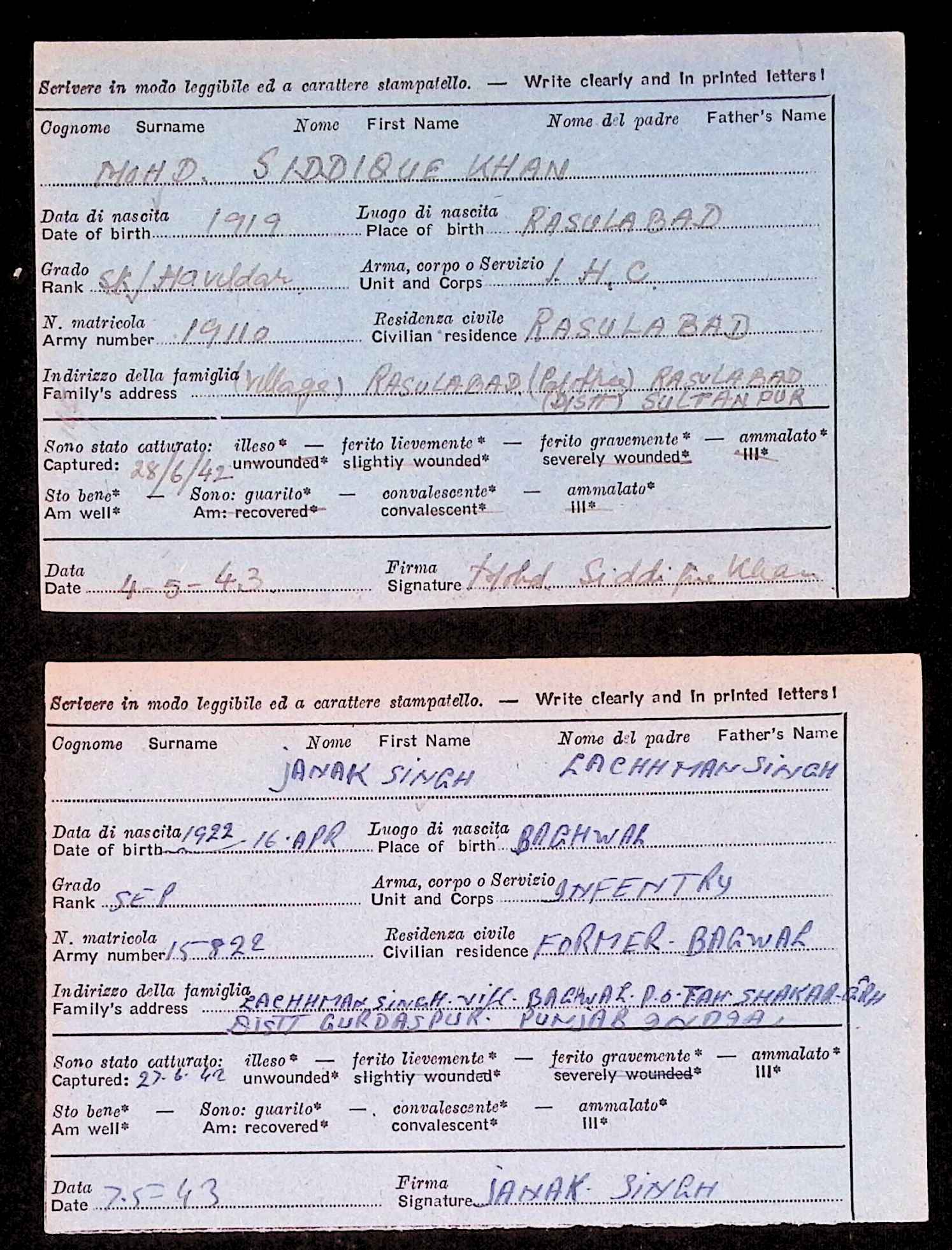 1943 Italian prisoner of war information cards for captured Indian soldiers. Estimate $50. (Image1)