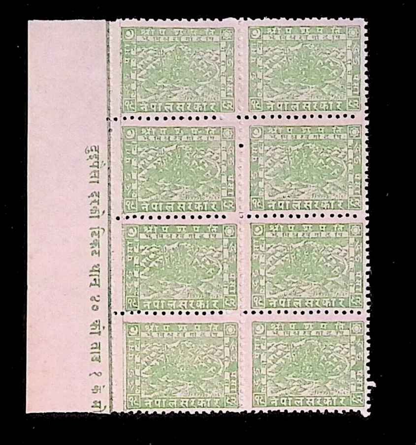 Nepal, Scott 44a 1941 2 pice green error of color, block of 8 mint never hinged. Estimate $40. (Image1)