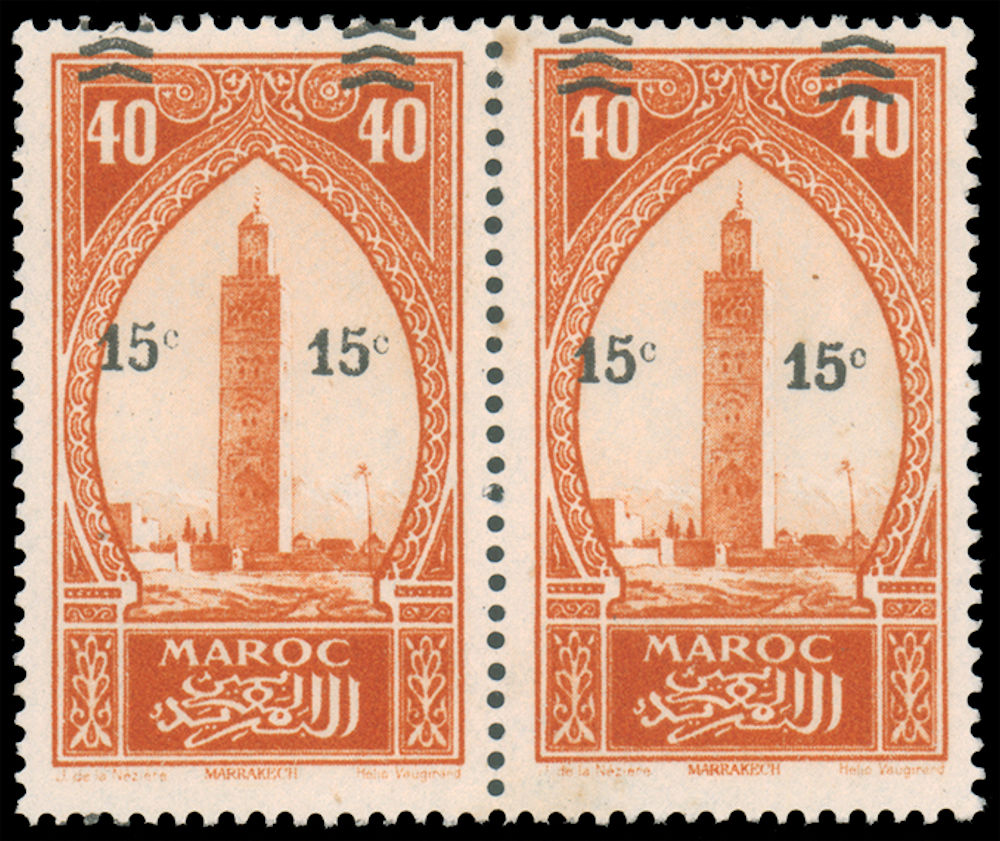 FRENCH MOROCCO, 1930, 15c on 40c ORANGE RED - OVERPRINT SHIFTED UP LEAVING "40" CLEAR - PAIR, #120 var., right stamp NH, other LH, tiny perf. toning spot on back, very fine, attractive transitional variety. Donated by Paradise Valley Stamp Company. (Image1)