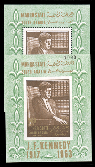 ADEN, MAHRA STATE, 1967, JFK SOUVENIR SHEETS PERF & IMPERF NH, fresh and very fine, cat. MI #24A & 24B @ €77.00. Donated by Paradise Valley Stamp Company. (Image1)