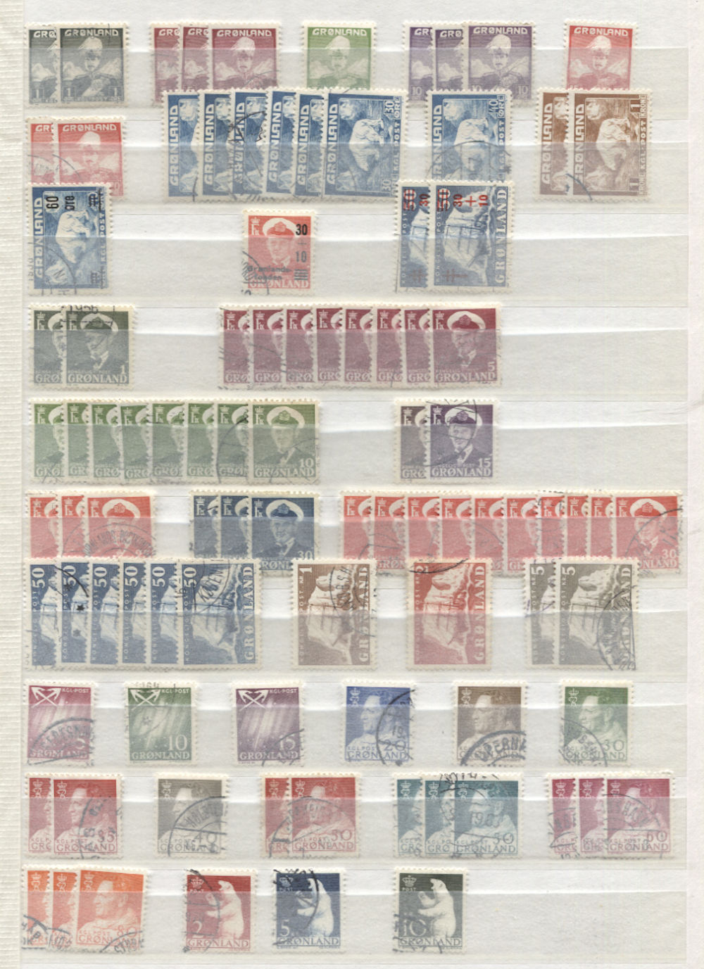 GREENLAND, 1938-1983, ACCUMULATION ON STOCK PAGES USED, includes nos. 1-9, THULE set, fresh and very fine, cat. $300.00 plus Facit SEK 995 (approx $100.00 USD) for Thule stamps. Donated by Paradise Valley Stamp Company. (Image1)