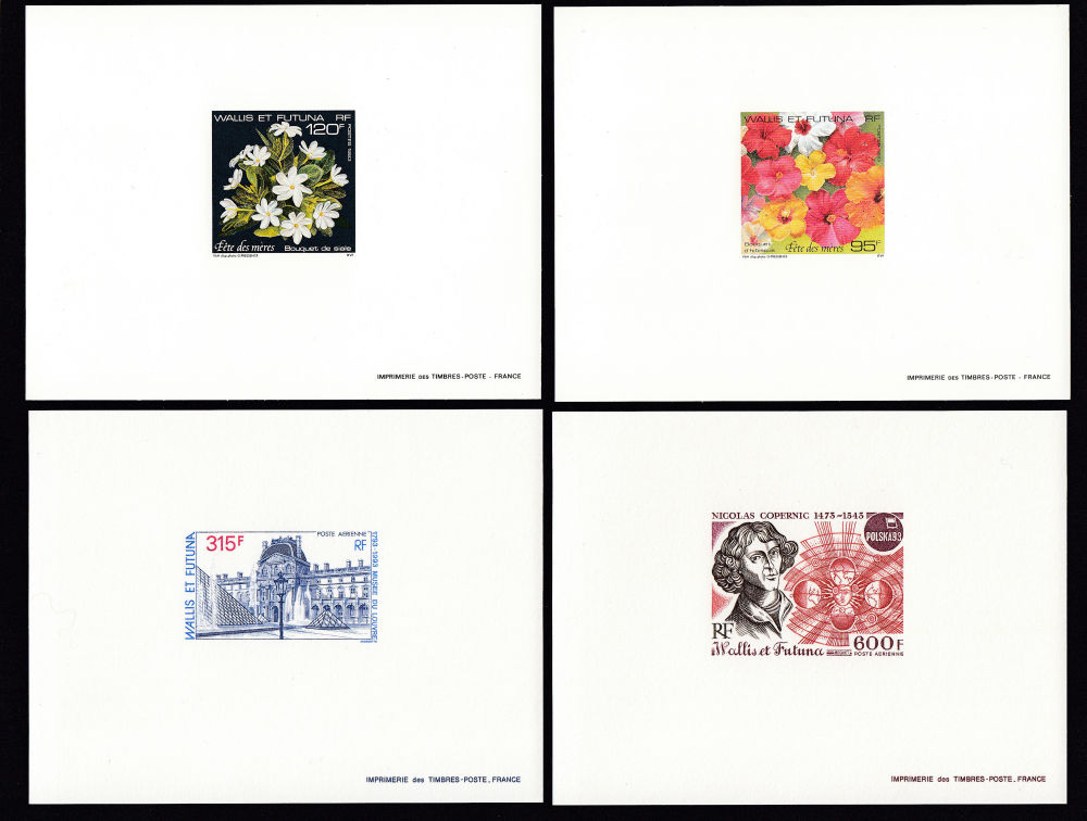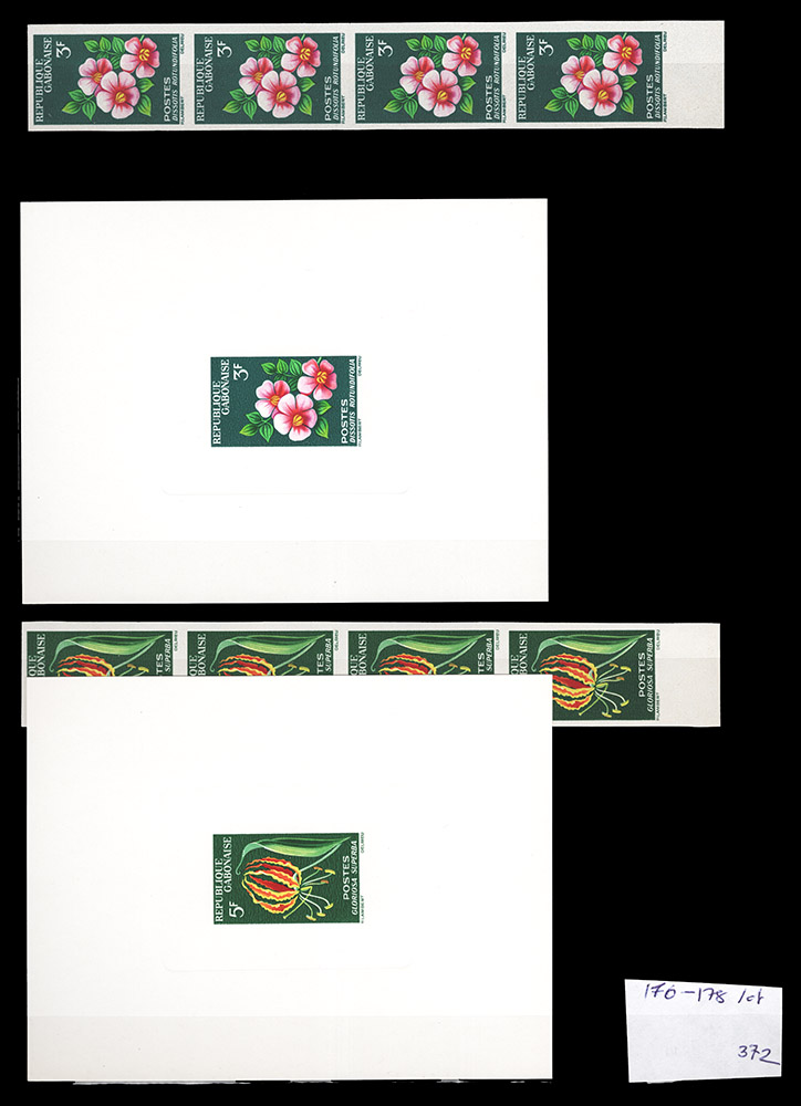 GABON FLOWERS IMPERFORATE & PROOFS, #176-78, imperforate mint never hinged strips of four, set of de luxe proofs, also two FDCs, very fine. Donated by Paradise Valley Stamp Company. (Image1)