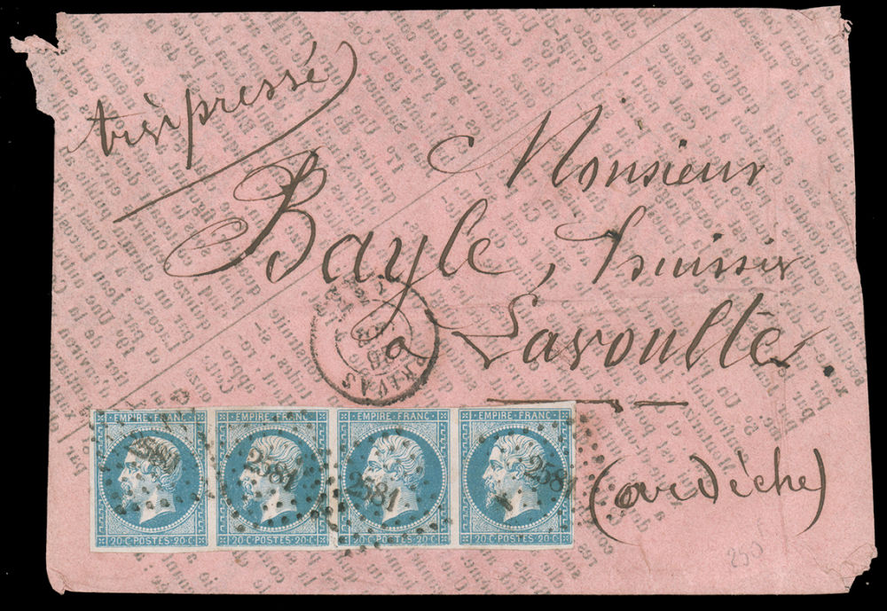 FRANCE, 1854, 20c BLUE STRIP OF FOUR ON COVER, #15, tied by "2581" numeral diamond on printed matter cover, six-time single rate, fine-very fine. Donated by Paradise Valley Stamp Company. (Image1)