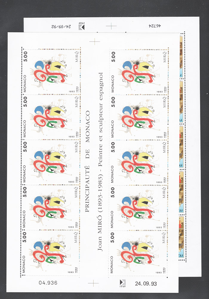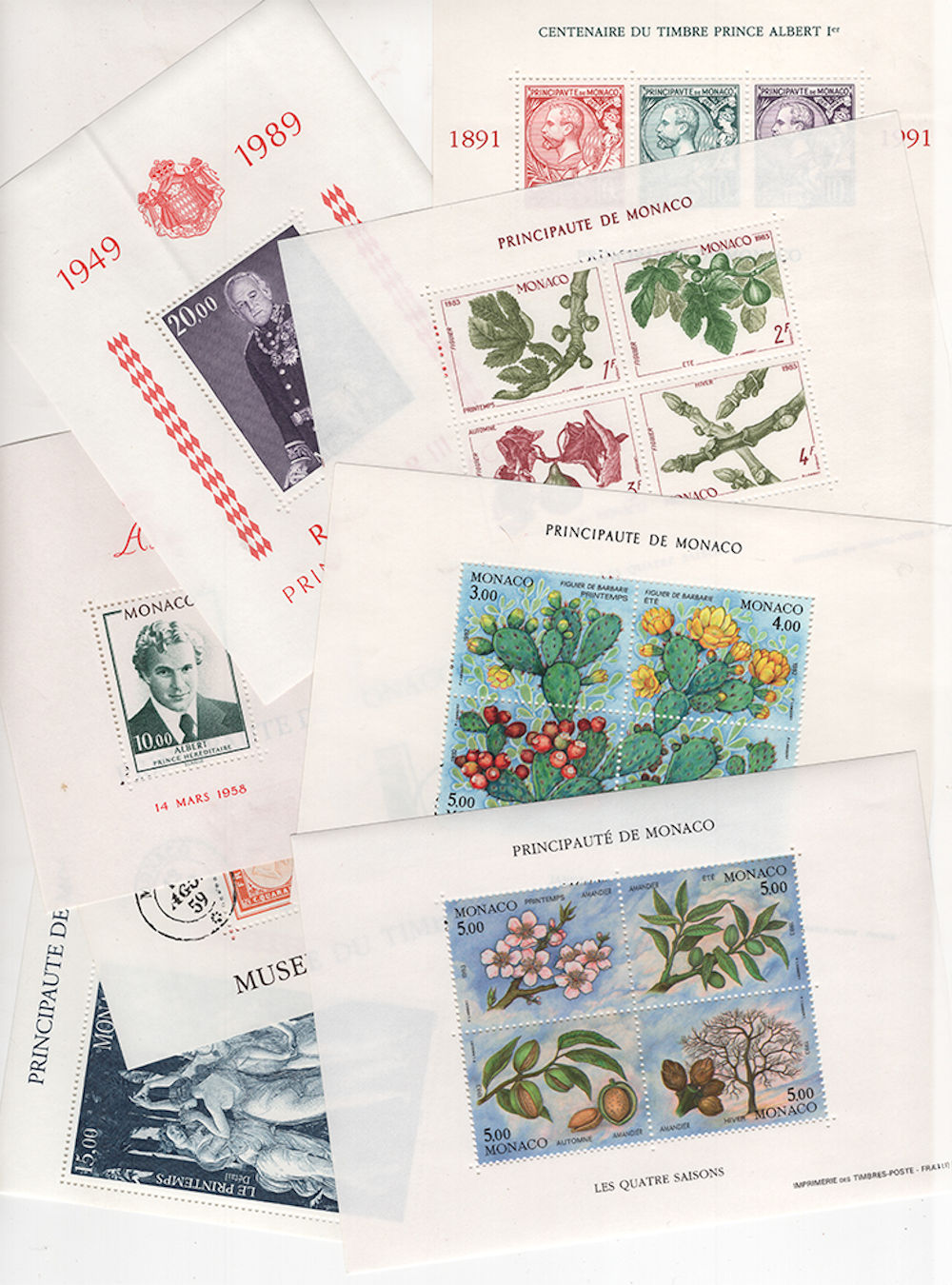 MONACO SOUVENIR SHEETS AND MINIATURE SHEETS 1986-93, eight diff., very fine, cat. $197.50. Donated by Paradise Valley Stamp Company. (Image1)