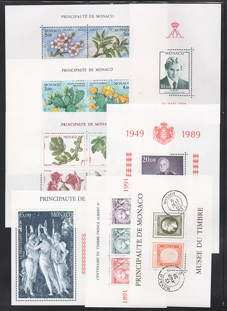 MONACO ATTRACTIVE LITTLE GROUP OF NH SOUVENIR SHEETS 1989-93, ten diff., very fine, cat. $99.00. Donated by Paradise Valley Stamp Company. (Image1)
