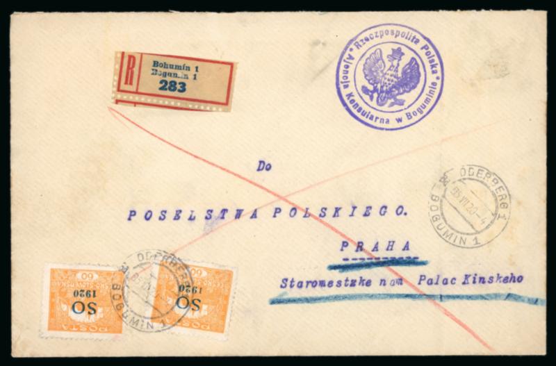 1920 Group of 7 covers with some from the Polish Consulate in Bohumin incl. three registered covers with 140 heller rate, each with a different combination, one mixed franking with two unoverprinted Czech stamps, etc., an interesting lot (7). (Image)