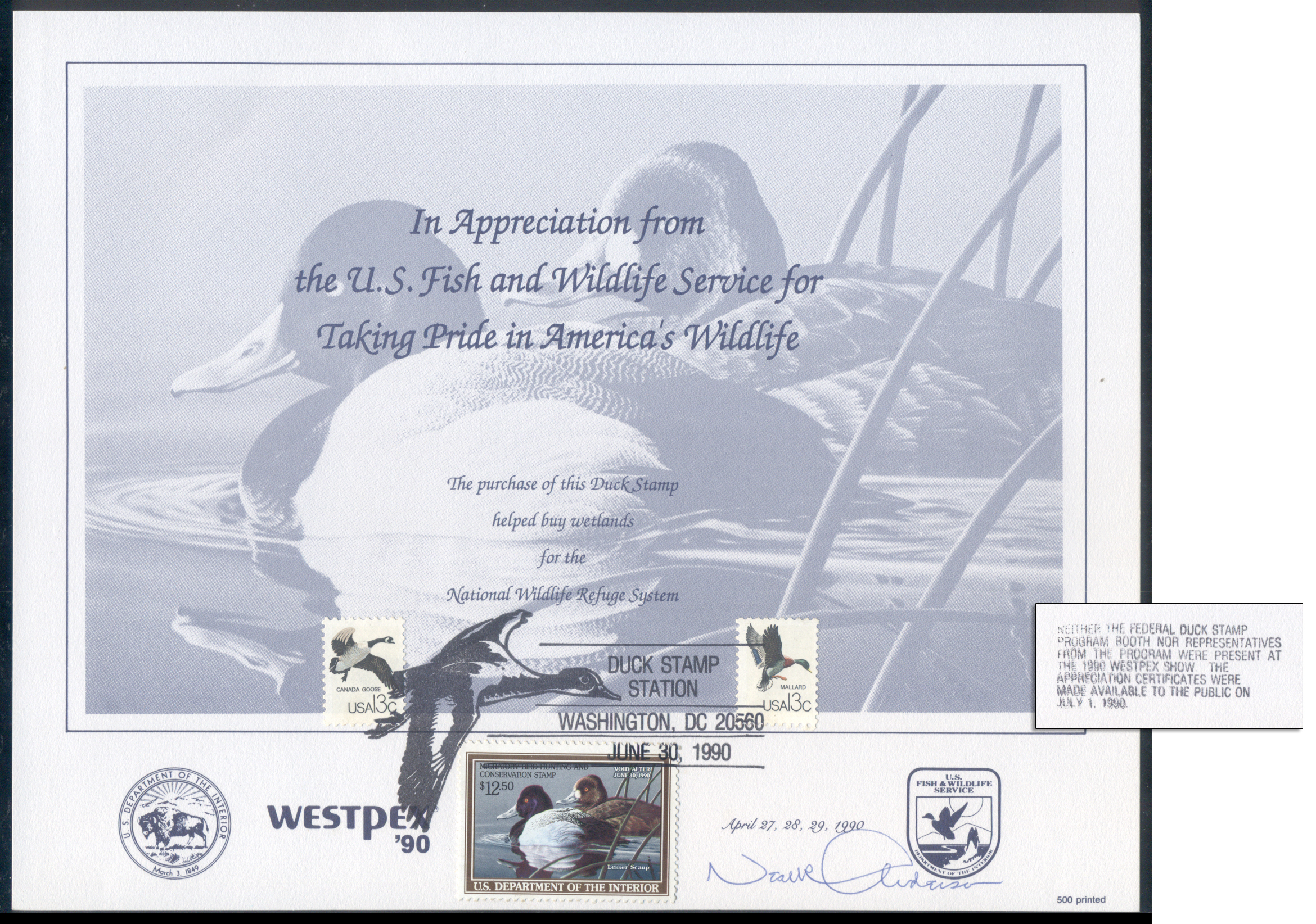 Card 33 (N5f),RW56 1989 Lesser Scaup, from WESTPEX 1990, held April 27-29, but the RW56 is ccld with the duck stamp station ccl of June 30, 1990. This is the ccl created by Jim Hautman for the First Day of Sale for RW57. The back of the card is stamped, "Neither the Federal Duck Stamp Program booth nor representatives from the program were present at the 1990 WESTPEX show." The Appreciation certificates were made available to the public on July 1, 1990. No Washington, DC, July 1 ccls were available, however the June 30 cancellation for RW57 was held open for 30 days. SCARCE! (Image)