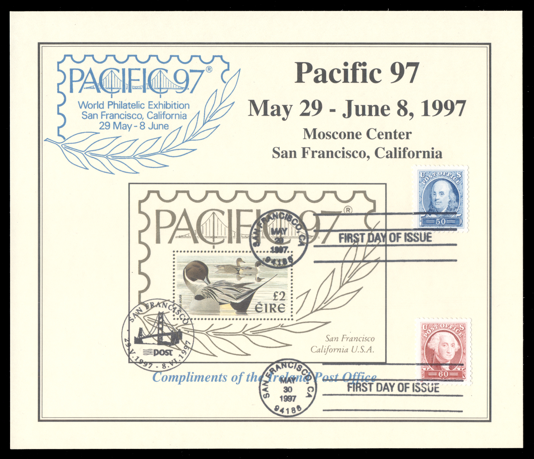 Card 92a,Pacific '97 Souvenir Card from the Ireland Post Office, the card pictures a £2 Pintail and has a May 29, 1997 First day cancel for the #3139a 50¢ Benjamin Franklin stamp and a May 30, 1997, First Day cancel for #3140a 60¢ George Washington stamp. Card measures 8.5" x 7, quantity issued unknown (Image)
