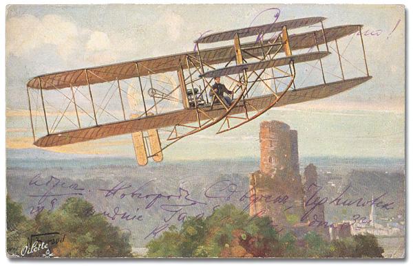 "Wright Aeroplane", a pretty multicolor Tuck "Oilette" picture postcard; long handwritten message in German(?) fills the back and spills onto the front, unmailed, Very Fine and scarce. (Image)