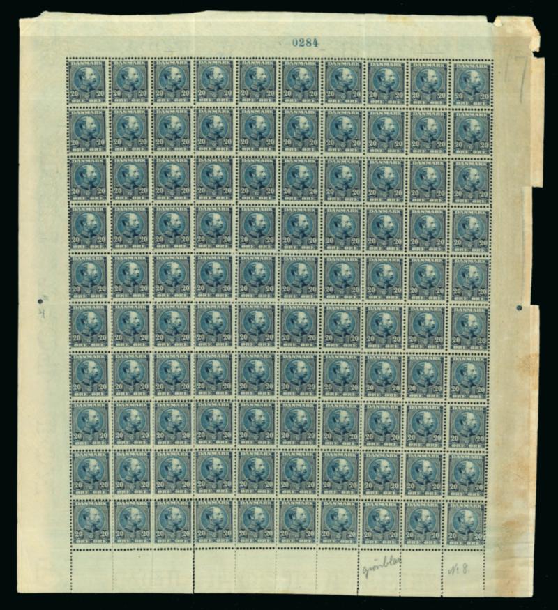 1904-05 Christian IX 20 ore blue, mint nh complete sheet of 100 showing full and impeccable gum, with sheet margins all round and serial number "0284" at top, some perf. separations and usual creases, fresh, very fine and most certainly one of the few intact sheets. (Image)