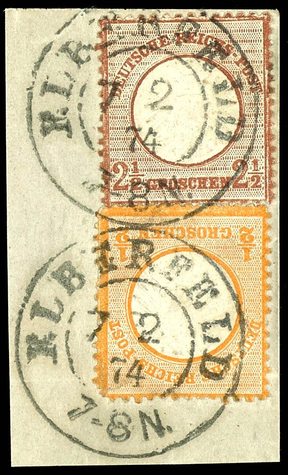 2 1/2 Groschen large shield, brown as fresh colours extremely fine copy in mixed franking with 1/2 Groschen large shield orange (three short perfs) on piece with cancellation through dual circuit cancel "ELBERFELD 7 2 74", photo expertize Hansmichael Krug BPP (2023), Michel 2.000.- (21c,18) Certificate(Image 1)(Image)
