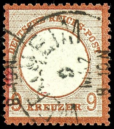 9 Kreuzer großer Schild, braun, entwertet mit altem Badenstempel WERTHEIM 9 MRZ 8-10N , Fotoattest Martin-Wolfgang Sommer BPP "echt, normal geprägt, einwandfrei zentriert und in sehr guter Zähnung, Sie ist sehr gut erhalten.", Mi. 1.700.-