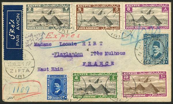 16/NO/1935 ZIFTA - France, express airmail cover with very attractive multicolor postage, and transit and arrival backstamps, VF quality! (Image)