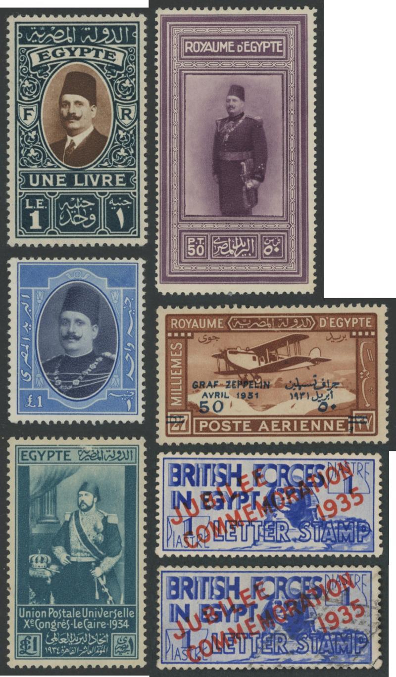 Selection to 1950s from 1924 King Fuad £E1 *, 1925 Geographical Congress 15m dark blue * & set used, 1926 King Fuad Birthday 50p *, 1927-37 King Fuad set to £1 * with extra shades including 100m x4 plus 500m & £1 x2 used, 1931 Zeppelin overprint duo *, 1933 Aviation Congress set used, 1933 Railway Congress set *, 1934 UPU Congress 200m, 50p & £E1 * plus £E1 used, 1938 King Farouk Birthday £E1 *, 1939-46 King Farouk 50p & £E1 * plus 1948 £E1 'PALESTINE' overprint *, 1947-51 King Farouk 50p & £E1 ** plus 1952 Sudan overprints * & 1953 King Obliterated *, 1950s Queen Nefertiti values to £E1 * & used, etc, also British Forces NAAFI Seals 1935 Silver Jubilee overprint on 1p ultramarine * & used, a few with minor gum tropicalisation and/or adhesion otherwise generally fine to very fine, Cat £3600+.