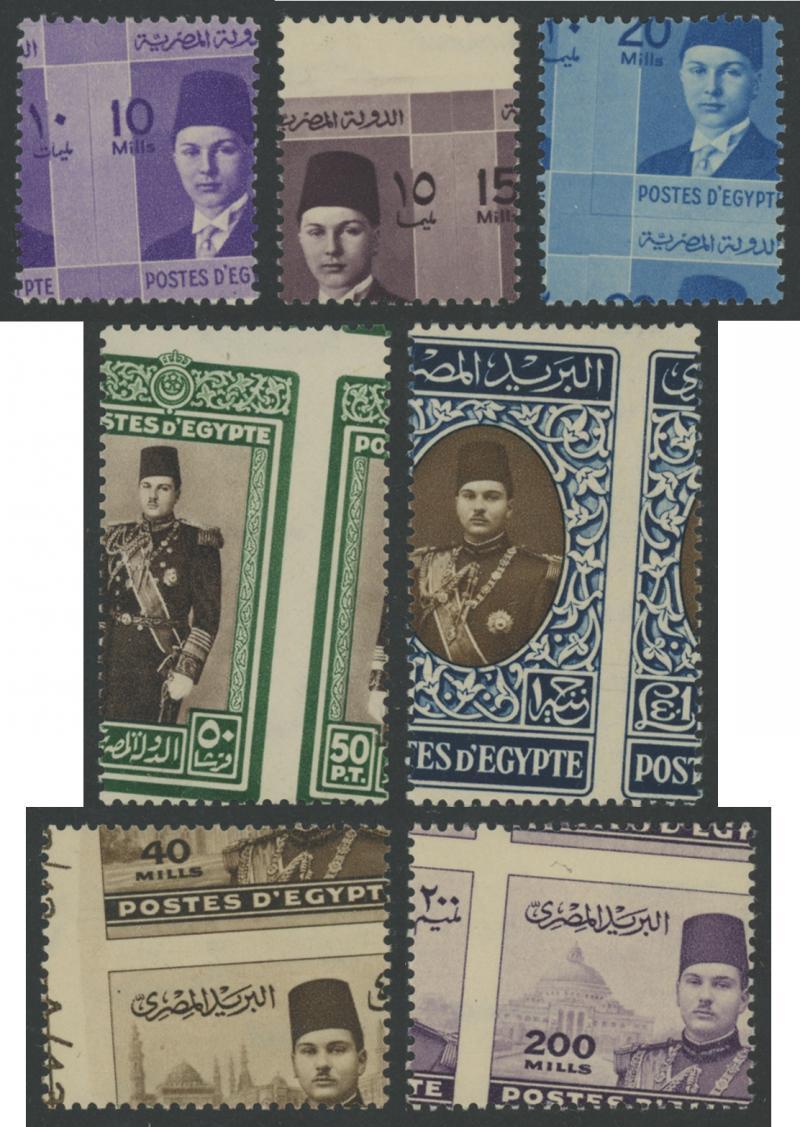 1937-44 King Farouk Investiture set SG 248-258 (ex 13m & 20m grey) and 1939-46 King Farouk & Pyramids set SG 276-283 complete, all 'Palace' Mis-Perforations created per favor for the King's Collection (later sold), unmounted.