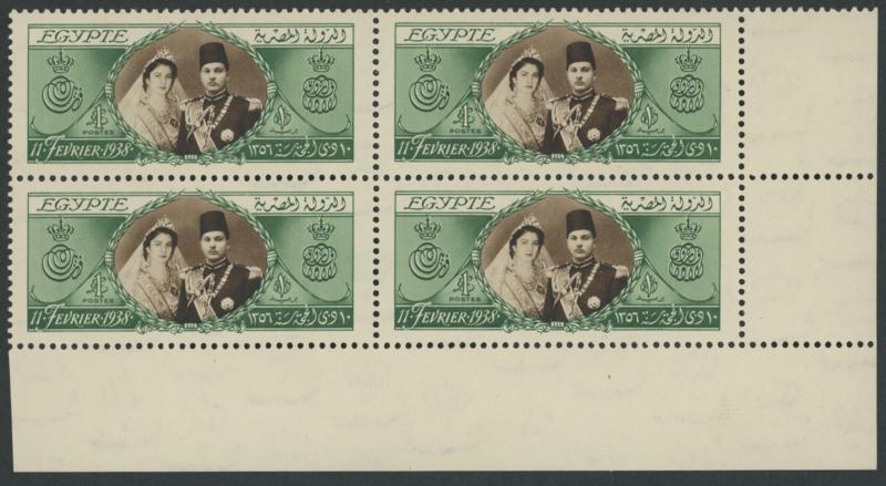 1938 King Farouk Birthday £E1 sepia & green SFG 272 (Scott 224) marginal block of 4 from the lower-right corner of the sheet, well-centred, the two upper units each with a tiny spot of gum disturbance, unmounted, Cat £1000+ (US$800+) for mounted. (Image1)
