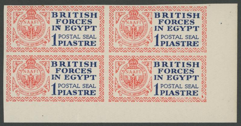 BRITISH FORCES IN EGYPT: 1932 NAAFI 1pi 'POSTAL SEAL' on gummed unwatermarked paper as SG A1 but Imperforate five marginal blocks of 4, margins good to huge, unmounted; and an imperf single tied to the back of a Forces in Egypt cover that is presumably a faked usage. Not listed by Gibbons so presumably plate proofs?