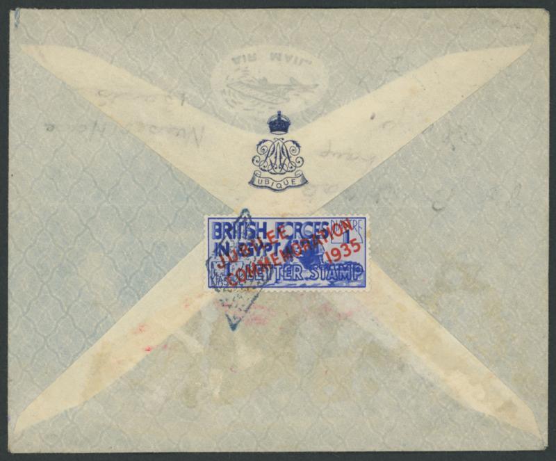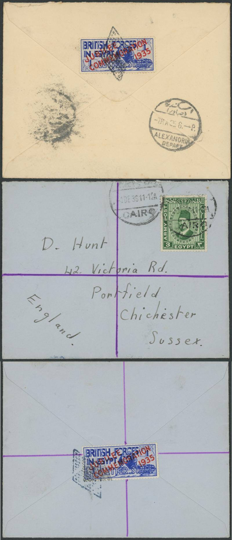 BRITISH FORCES IN EGYPT: 1935-36 covers each with 1935 Silver Jubilee 1pi ultramarine SG A10 tied to the reverse by a retta cancel in various colours comprising a second day usage of '.../7MA35/ABU QIR', another May 1935 usage at Cairo (vertical crease through the stamp), apparently commercial registered usage at Alexandria, and three philatelic usages of which two have the Fuad 3m on the face used on the First Day of Issue. A very unusual opportunity.