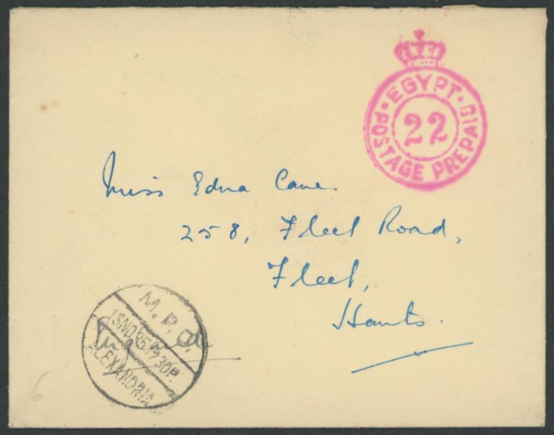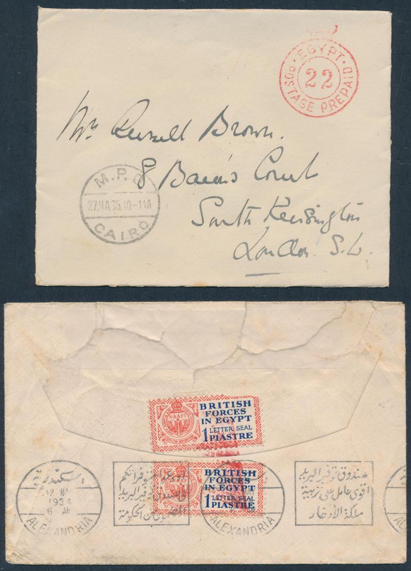 BRITISH FORCES IN EGYPT: Philatelic covers with various adhesives on the reverse and all different '[crown]/EGYPT/[numeral]/POSTAGE PAID' postmarks with most numbers between '1' and '25' in various colours, all with various 'M.P.O.' cds of 15MR36, generally very fine; also printed 'POSTAL CONCESSION/...' notice advising that all stamps (SG A1-A11) could be used "...up to and including the 15th March, 1936. After that day they will cease to be of postal value..." Also advising that usage was restricted to the UK and the Irish Free State!
