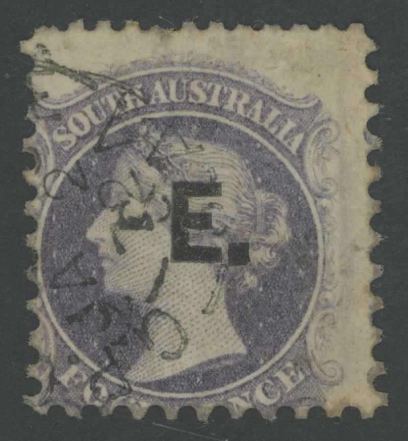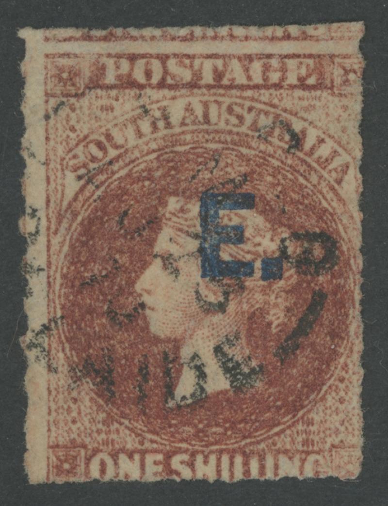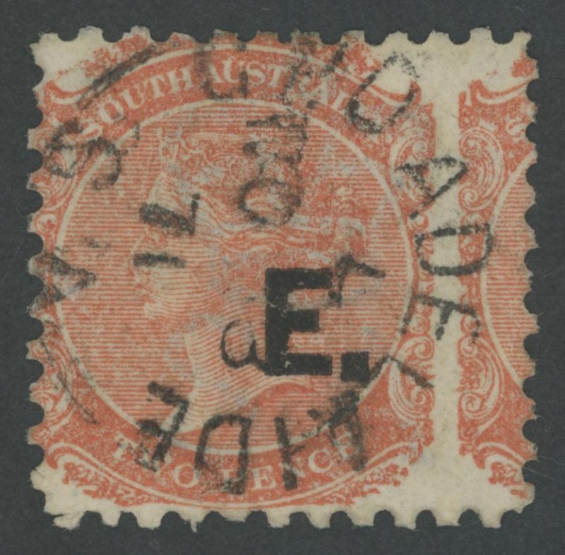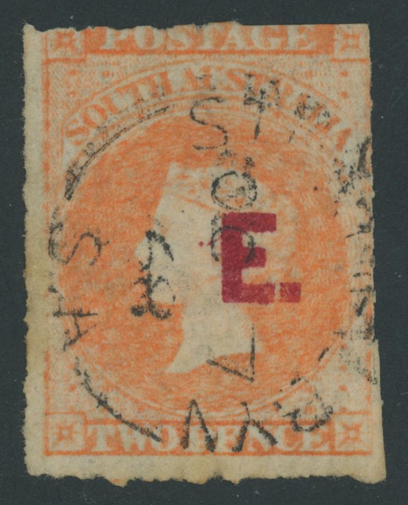 RED OVERPRINT: 'E.' on QV Perkins Bacon Large Star Wmk Rouletted 2d vermilion SG DO193, rouletting on all sides, faint toning on the reverse, 'STRATHALBYN/OC7/68/S.A' cds, Cat £140. Rated RR. Ex 'Sir Humphrey' (Brian Farmer): sold for $245 (Sale 118 Lot 342). [Date range 17.7.1868 to 7.10.1868] (Image1)