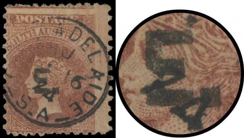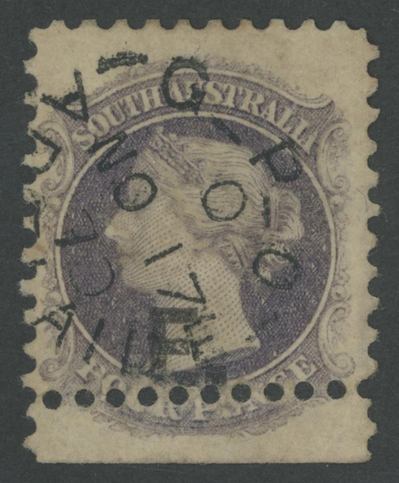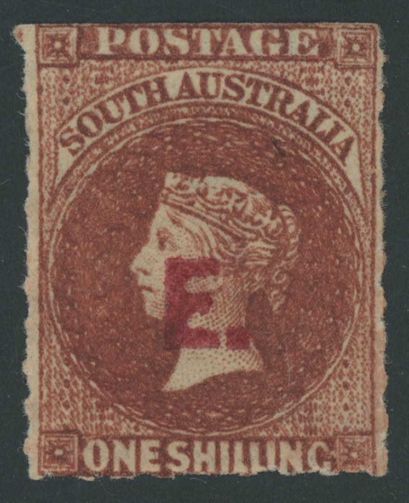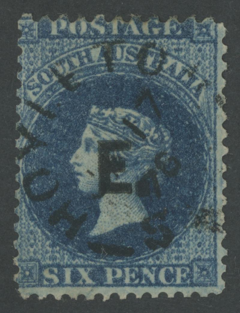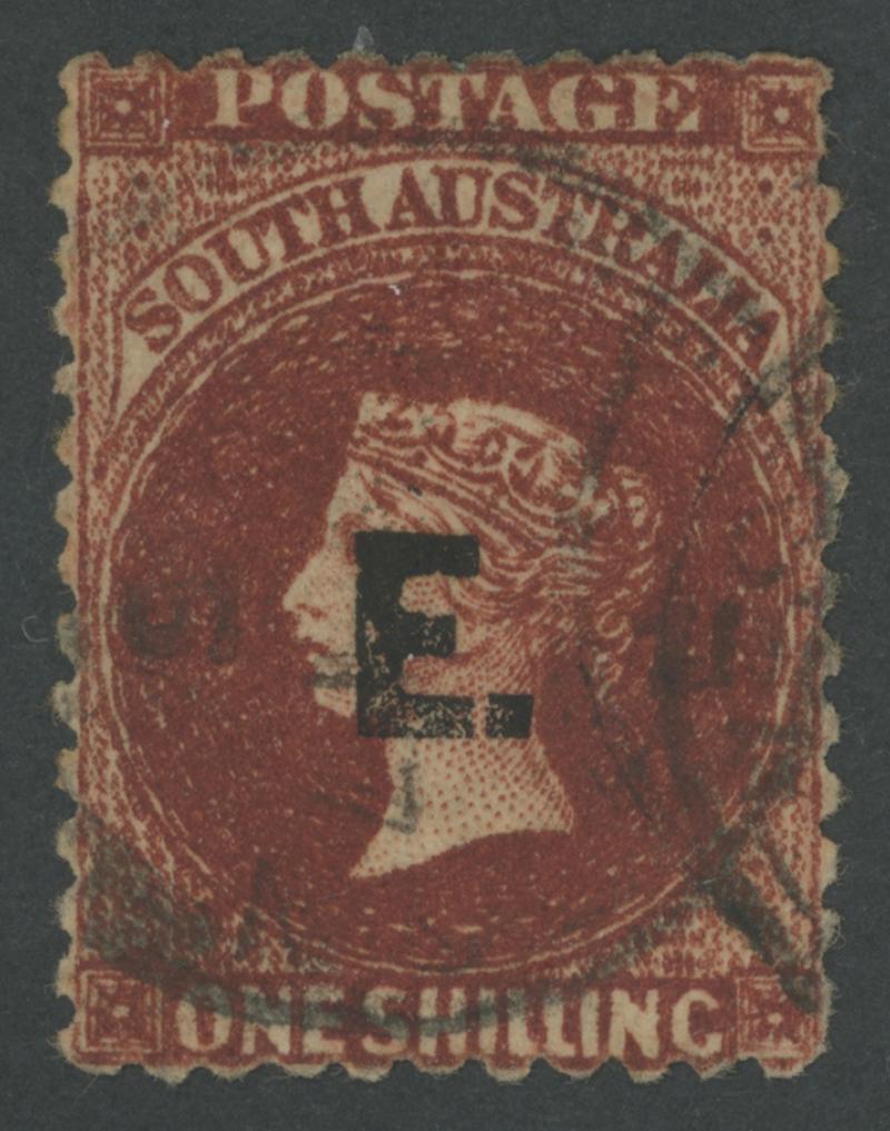 RED OVERPRINT: 'E.' on QV Perkins Bacon Large Star Wmk Rouletted 2d vermilion SG DO193, rouletting on all sides, faint toning on the reverse, 'STRATHALBYN/OC7/68/S.A' cds, Cat £140. Rated RR. Ex 'Sir Humphrey' (Brian Farmer): sold for $245 (Sale 118 Lot 342). [Date range 17.7.1868 to 7.10.1868] (Image1)