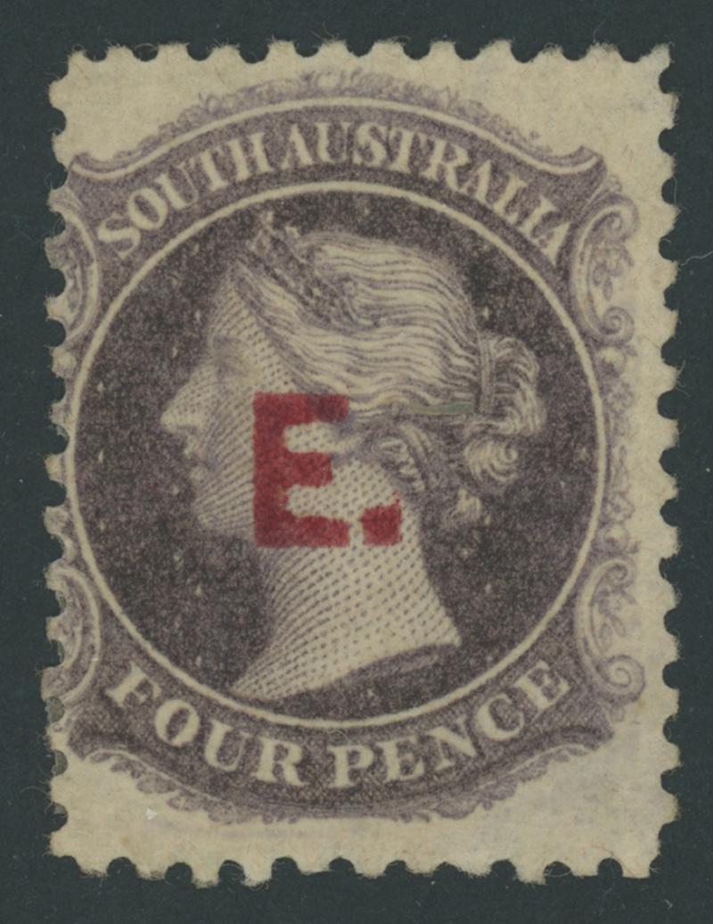 RED OVERPRINT: 'E.' on QV Perkins Bacon Large Star Wmk Perf 11½-12½ 4d deep purple SG DO196, an unusually large example, large-part gum, Cat £950. Rated RRRR. Ex Colonel Napier (I). RPSV Certificate (1979). Superior to the 'Besancon' example that sold for SFr1210. Absent from Don Pearce's collection. (Image1)