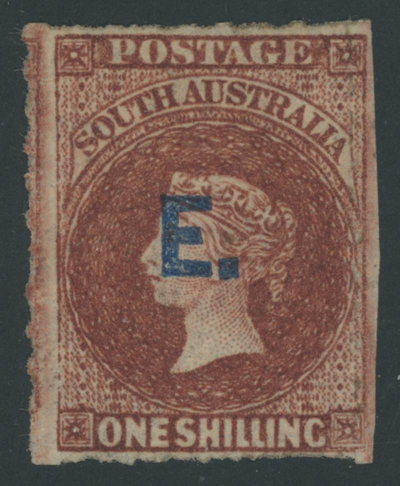 BLUE OVERPRINT: 'E.' on QV Perkins Bacon Large Star Wmk Rouletted 1/- red-brown SG DO198, rouletting on all sides & cut from the sheet at right to preserve the design, part-gum, unpriced unused by Gibbons. Rated RRRRR. Ex Baron von Ferrary, Theodore Champion and Philip Croker. Chris Ceremuga Certificate (2009) states "extremely rare". Absent from the 'Besancon' and Don Pearce collections. (Image1)