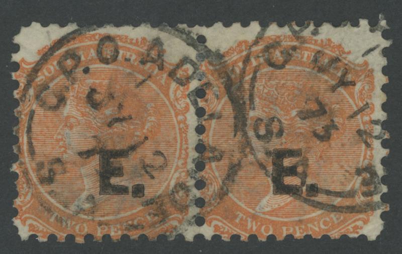 BLACK OVERPRINT: 'E.' on QV De La Rue Crown/SA Wmk Perf 10 2d red-orange SG DO204 horizontal pair, GPO cds of 'JY12/73', Cat £220+. Rated S+. A very scarce multiple. Ex Peter Kowald: sold for $745 (Sale 246 Lot 538). [Date range 20.12.1870 to 10.8.1873] (Image1)