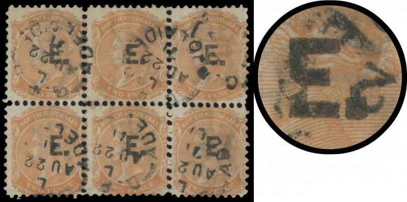BLACK OVERPRINT: 'E.' on QV De La Rue Crown/SA Wmk Perf 10 2d red-orange SG DO204 block of 6 (3x2), the second unit with Defective 'E' (Advanced State), brown writing-ink-stain on reverse of the variety unit, light wrinkles, GPO cds of 'AU22/71', Cat £660+. Rated S+. A rare multiple. Ex Don Pearce: sold for $600 (Sale 247 Lot 304), less than half what a similar but superb block of 6 without the variety sold for (Sale 247 Lot 393). On the upper-centre unit, the 'E' has a notch in the upright that later actually split into two sections: see Lot 289] (Image1)