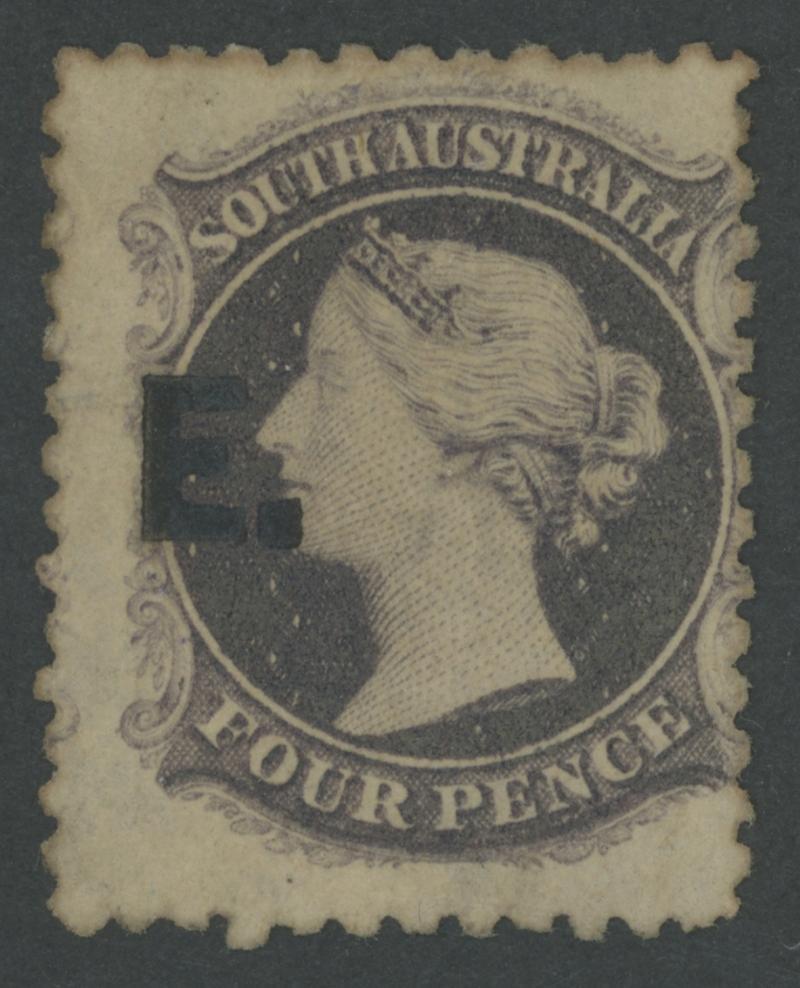 BLACK OVERPRINT: 'E.' on QV Perkins Bacon Large Star Wmk Perf 11½-12½ 4d slate-violet SG DO201, the Overprint Misplaced to Left, a little aged, unused, Cat £1200. Rated RRRR. Stated to be ex Colonel Napier. RPSV Certificate (1979). Lord Vestey's similar example sold for £780. The 'Besancon' example with part-gum sold for SFr1450. Absent from Don Pearce's collection. (Image1)