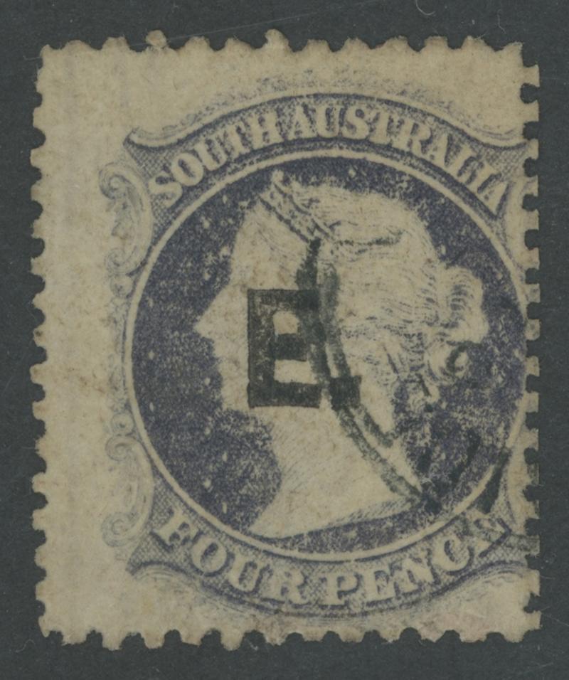 BLACK OVERPRINT: 'E.' on QV Perkins Bacon Large Star Wmk Perf 11½-12½ 4d slate-violet SG DO201, a little aged, indistinct GPO cds, Cat £120. Rated R. Ex Les Munn: sold for $145 (Sale 110 Lot 831). Don Pearce's very fine example sold for $192 (Sale 247 Lot 309). [Date range 24.8.1872 to -.6.1874] (Image1)