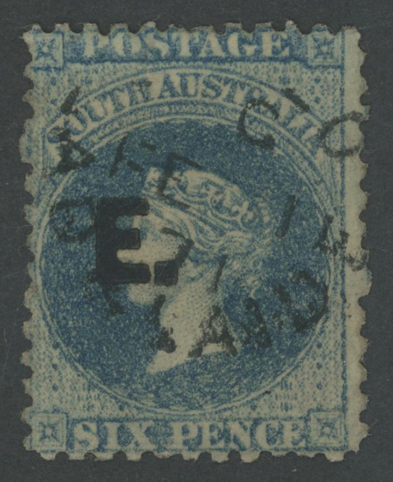 BLACK OVERPRINT: 'E.' on QV Perkins Bacon Large Star Wmk Perf 11½-12½ 6d Prussian blue SG DO202a, minor shallow thin, very fine strike of the rare 'HOYLETON/JA17/76/S-A' cds (rated RRR), Cat £350. Rated RRR. Ex Don Pearce: sold for $480 (Sale 247 Lot 313). Absent from 'Besancon'. (Image1)