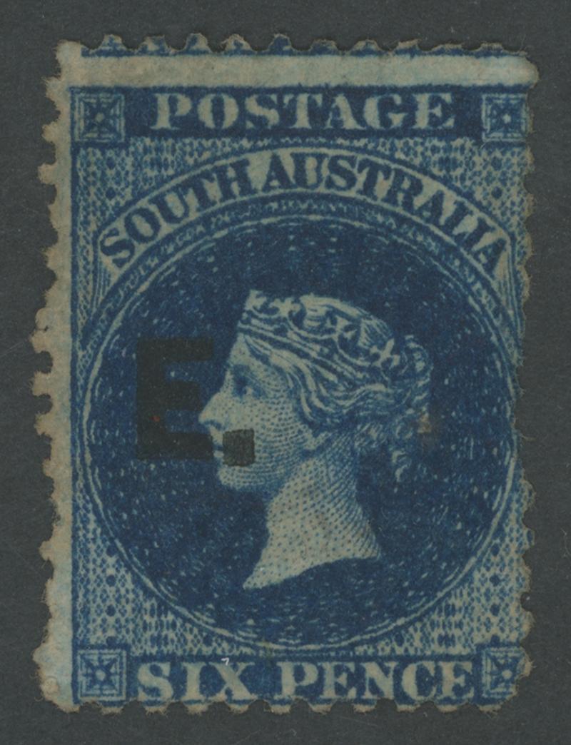 RED OVERPRINT: 'E.' on QV Perkins Bacon Large Star Wmk Rouletted 6d dull ultramarine SG DO194, rouletting except at top where cut from the sheet well clear of the design, large-part gum, Cat £650. Rated RRR. Ex Frederick Hall: sold for $440 (Sale 133 Lot 535). RPSV Certificate (1979). Victor Bullock's more attractive example - minor separation faults - sold for $2210 (Sale 130 Lot 443). The similar 'Besancon' example sold for SFr725. Don Pearce's very fine example sold for a very modest $895 (Sale 247 Lot 296). (Image1)