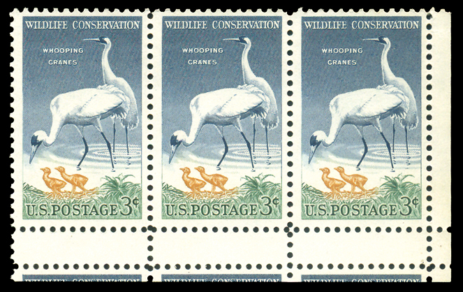 1098var, 3¢ Whooping Cranes, Lower Right Corner Margin Strip of 3 with Full Gutter Below and part of stamps from next sheet below, F-VF NH (Image)