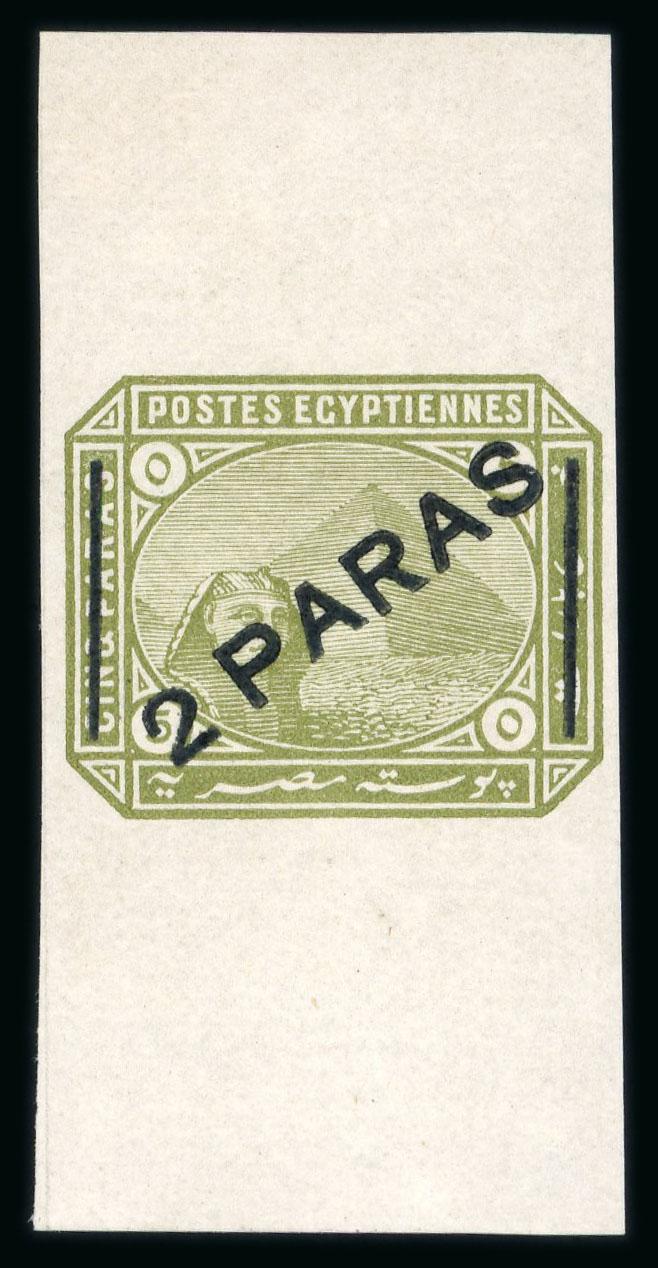 1879 De La Rue Essay of Surcharge: 2pa on 5pa olive green, imperforate single with sheet margin top and bottom on gummed unwatermarked paper, fresh, very fine and very rare, cert. Hass (1989); ex William Byam (ex lot 667 from a unique strip of six, from the Robson Lowe auction 1961). (Image)