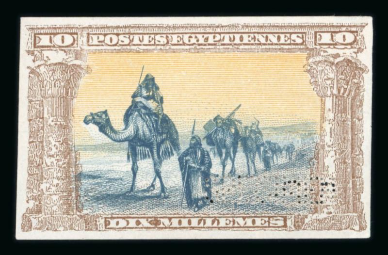 1906 Essay of Bradbury Wilkinson & Co, 10m. multicolour, with camels and Bedouins, sky background in yellow, and frame in grey-brown, "SPECIMEN" perfin, fine and most attractive essay, plus cut-out of the Bradbury Wilkinson legend from the same book that the essay came from. (Image)