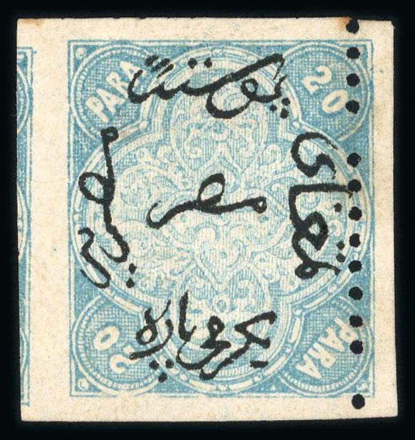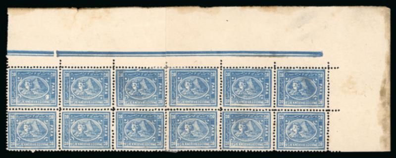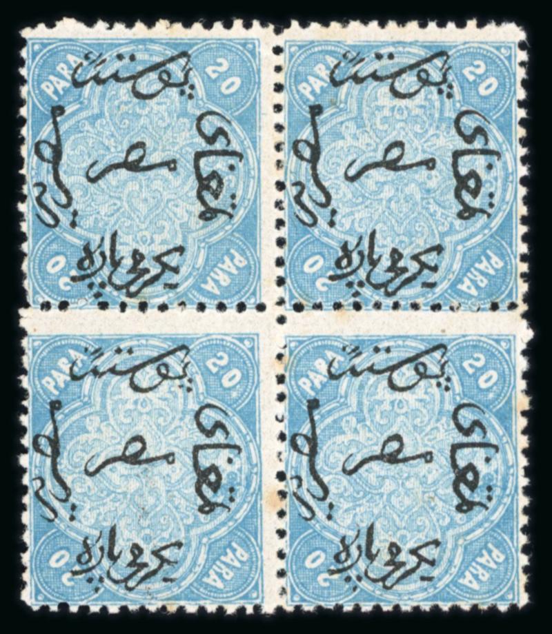1872 Third Issue 20 paras blue, sheet platings on large album pages housed in wonderful large green album with slipcase, with two sheet platings; the first with 180 out of 200 positions, the second 159 out of 200 positions, stamps are mostly used with some mint, in addition, there are 105 lithographed stamps mostly used, the stamps are mostly 12 1/2 x 13 1/3, a rare sheet reconstitution, ex Peter Smith.