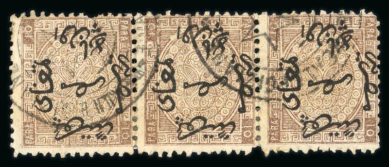 10pa brown, used strip of three with inverted overprint, fine and scarce used multiple (Image)