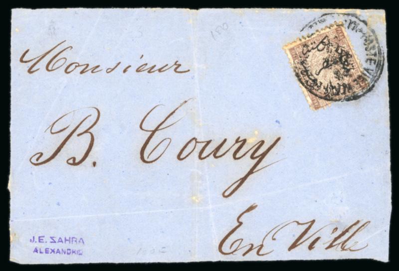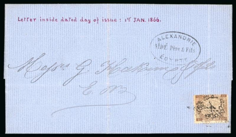 10pa Brown, single neatly tied by retta cancel on 1866 printed circular sent within Alexandria, the printed circular is datelined "January 1, 1866", which coincidently is the first day of issuance of the First issue, showing perfect strike of the "ALEXANDRIE / AÏDÉ Père & Fils / ÉGYPTE" oval company handstamp, an important usage on the first day of use, showpiece; ex William Byam. (Image)